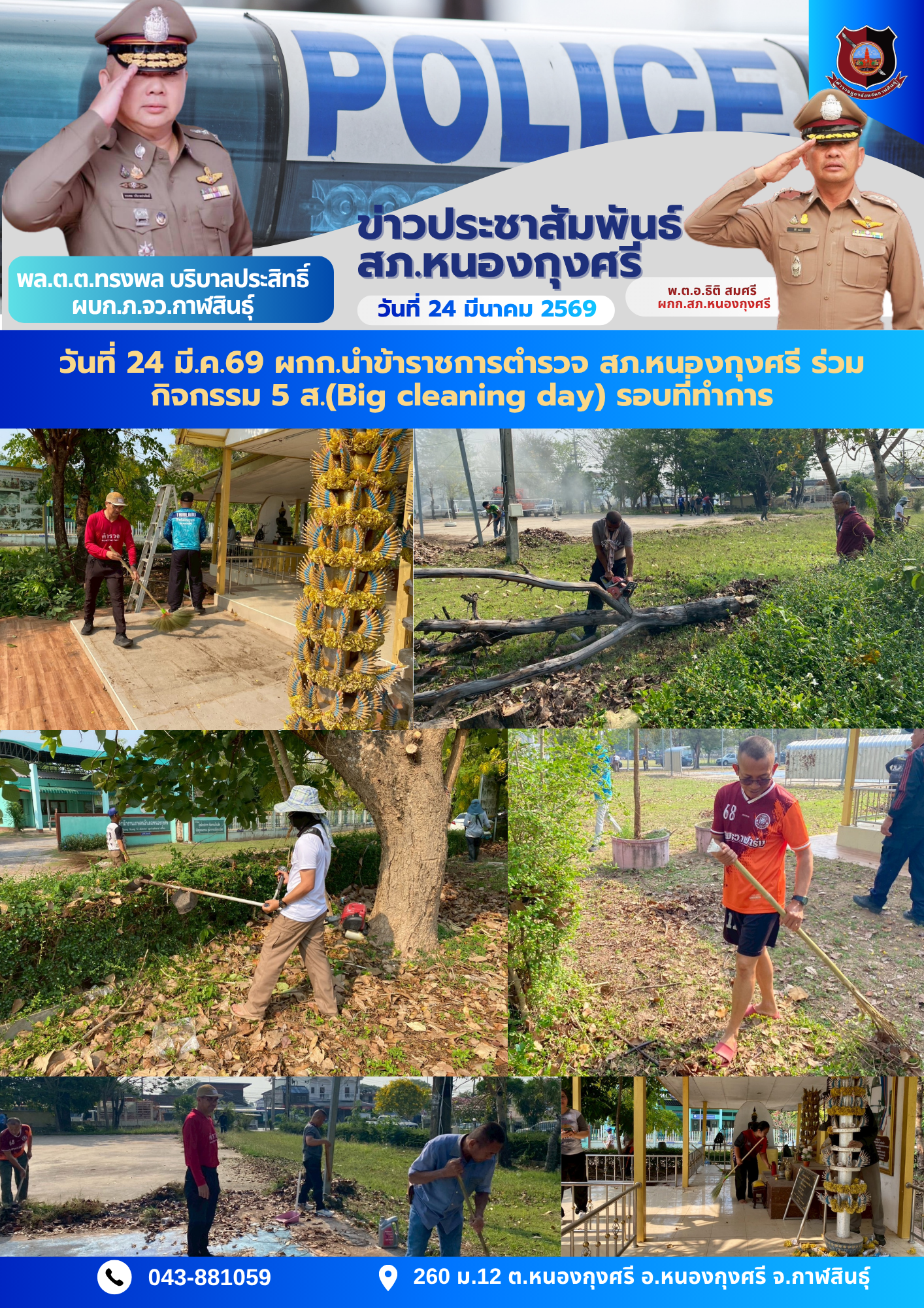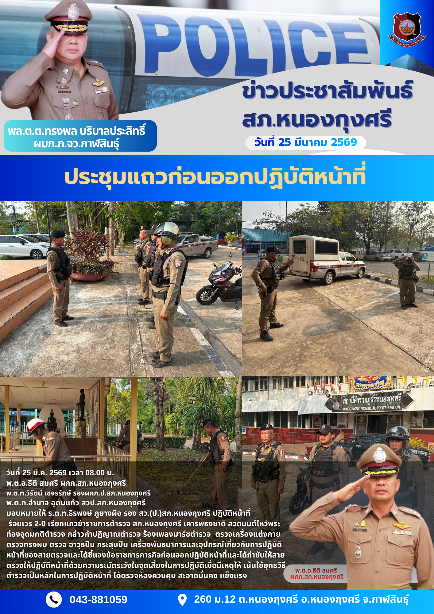 6 พฤศจิกายน 2567 เวลา 08.00 น. พ.ต.อ.สีหชาติ พรจรรยา ผกก.สภ.หนองกุงศรี พ.ต.ท.สมภาร แสนคำ รอง ผกก.(สอ