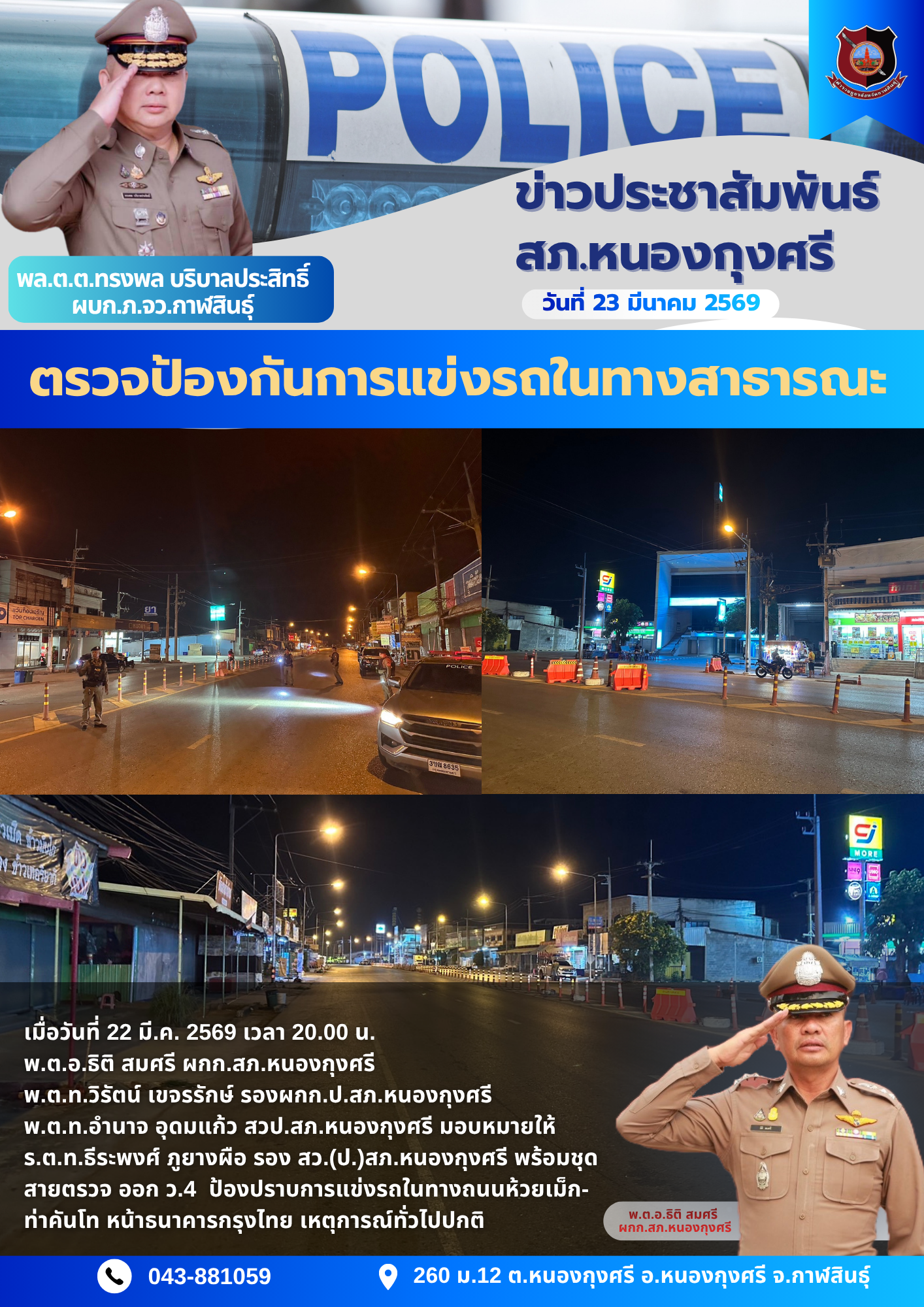 4 พ.ย. 2567 อำนวยการโดย พ.ต.อ.สีหชาติ พรจรรยา ผกก.สภ.หนองกุงศรี มอบหมายให้ ร.ต.อ.อรรณพ คำดีราช รอง.ส